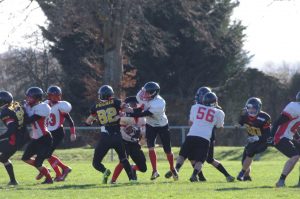 Les limougeauds prenaient l’avantage assez vite avec un touchdown transformé à 2 points (8-0), mais les Devils réagissaient bien grâce à un sursaut de la défense, qui mettait l’attaque en bonne position et permettait à Paco Maison (HB#21) de marquer sur une belle course de 25 yards. La transformation était manquée et la mi-temps était sifflée sur le score de 8-6.