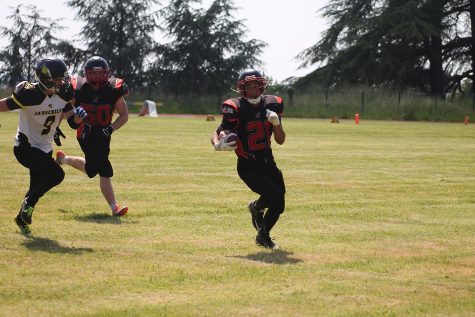 Les Devils remportent le toss et commencent le match en attaque : le premier drive est conclu par un touchdown d’Élisée Chambers (RB#21), transformé à 2 points à la passe par Brice Mora-Charrot (WR#11) 8-0. Les Rochelais rendent vite le ballon et un deuxième touchdown est marqué. Suite à un long gain à la passe de Quentin Ferlay (WR#7), Hugo Antonioli (QB#39) conclut à la course, et Elisée Chambers transforme à la course.